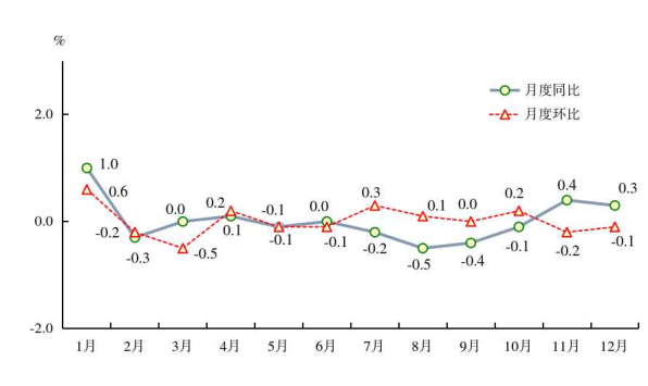 全年居民消费价格与上年持平。工业生产者出厂价格下降1.2%。工业生产者购进价格下降1.7%。农产品生产者价格下降2.5%。