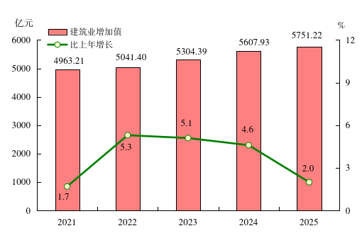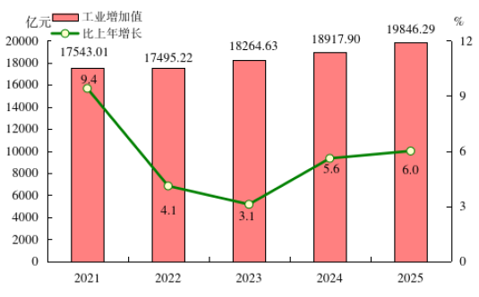 图5 2021-2025年全部工业增加值及其增长速度