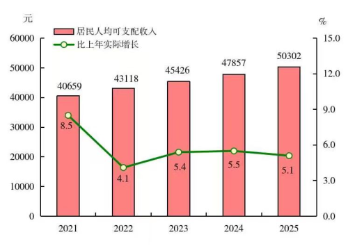 图10 2021—2025年居民人均可支配收入及其实际增长速度