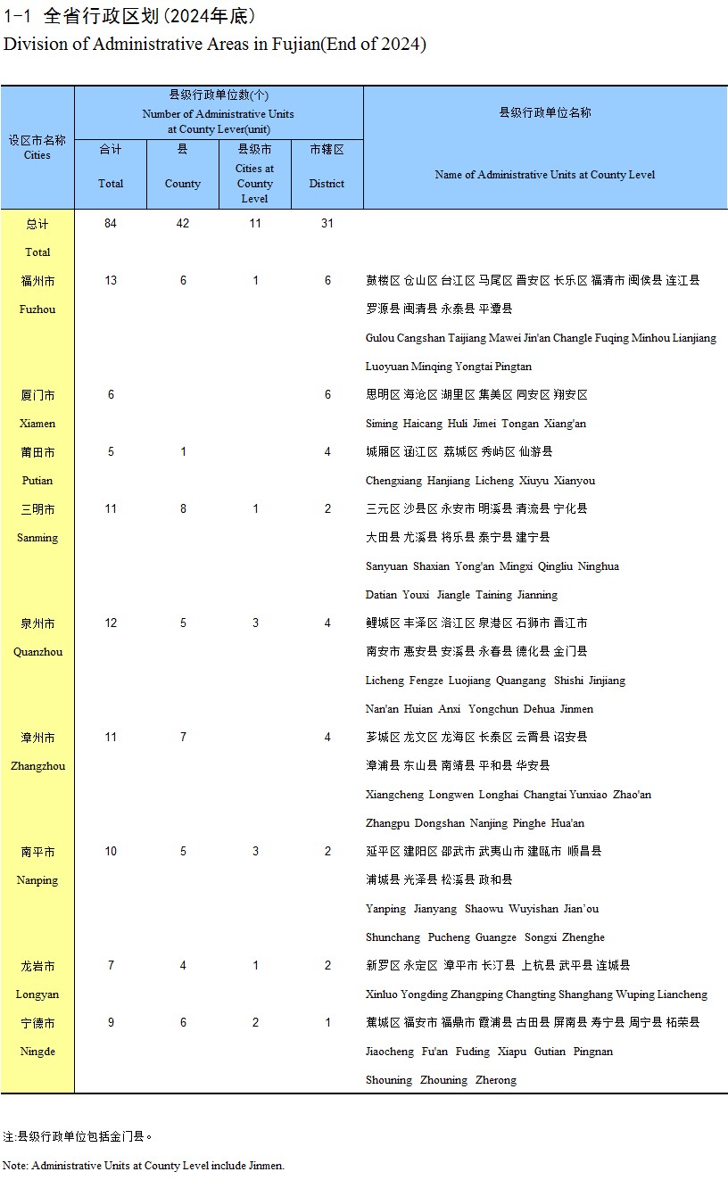 1-1 全省行政区划(2024年底)