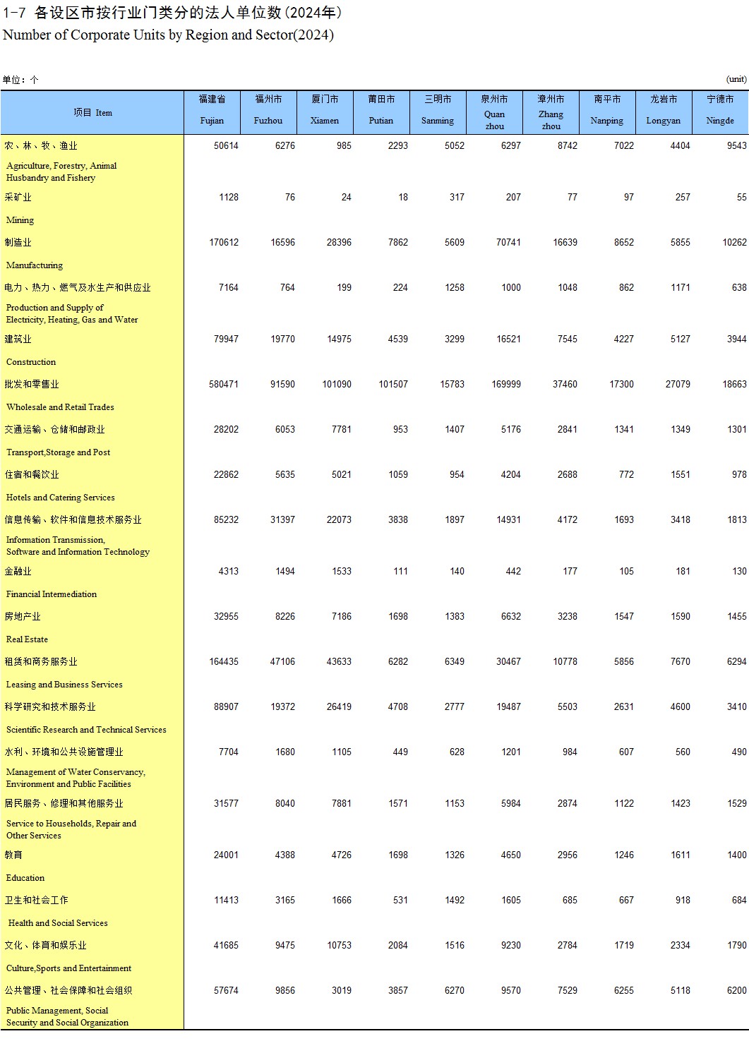 1-7 各设区市按行业门类分的法人单位数(2024年)