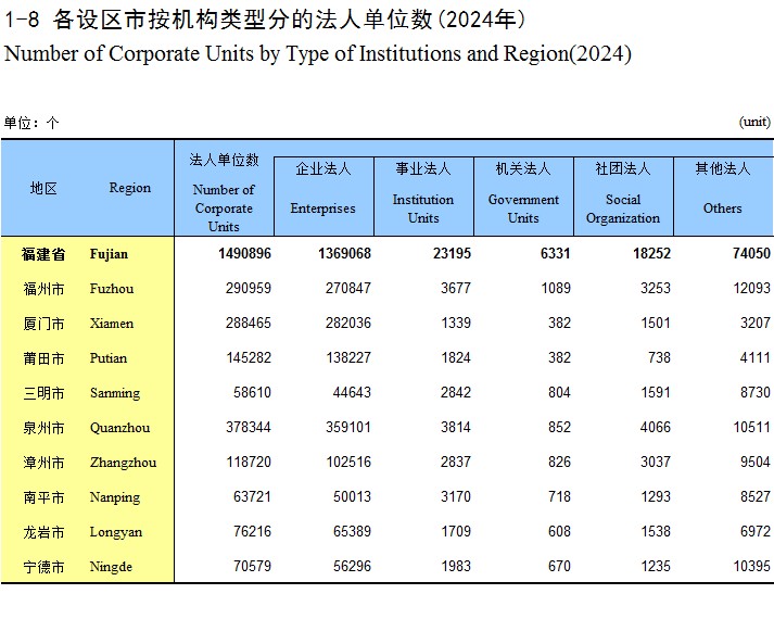 1-8 各设区市按机构类型分的法人单位数(2024年)