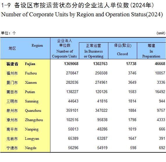 1-9 各设区市按运营状态分的企业法人单位数(2024年)