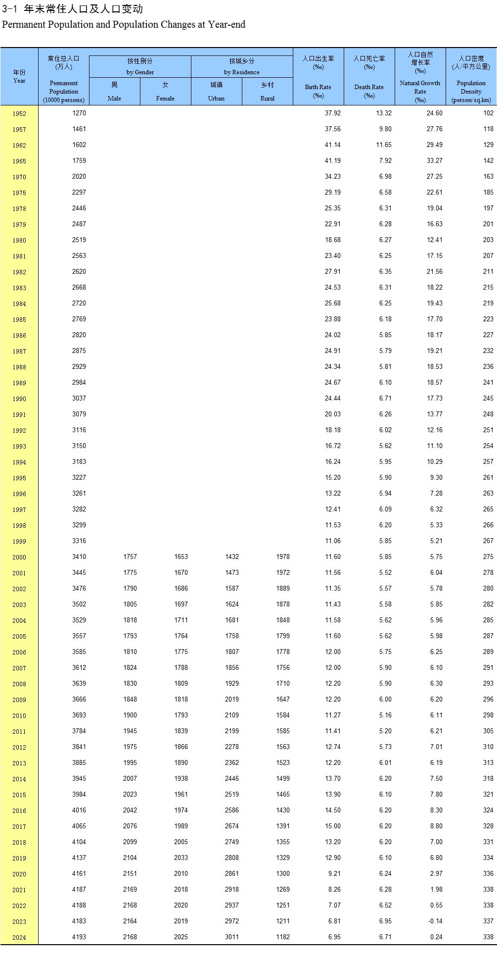 3-1 年末常住人口及人口变动