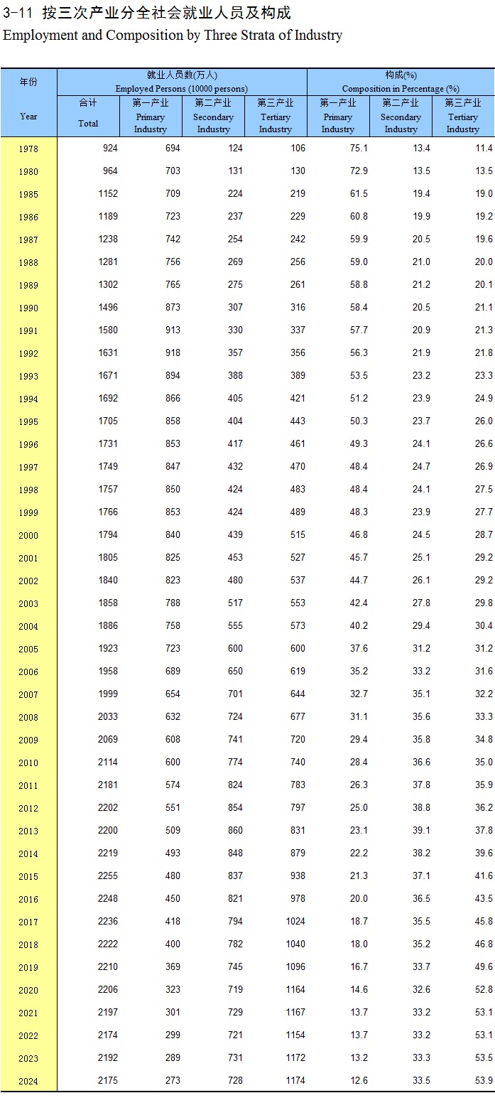 3-11 按三次产业分全社会就业人员及构成