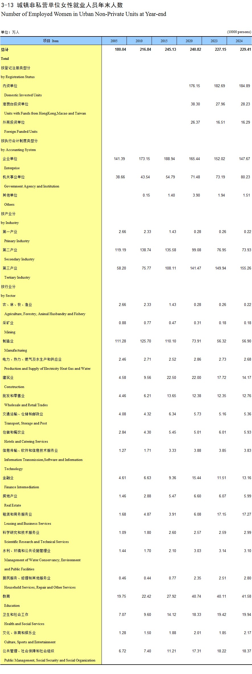 3-13 城镇非私营单位女性就业人员年末人数