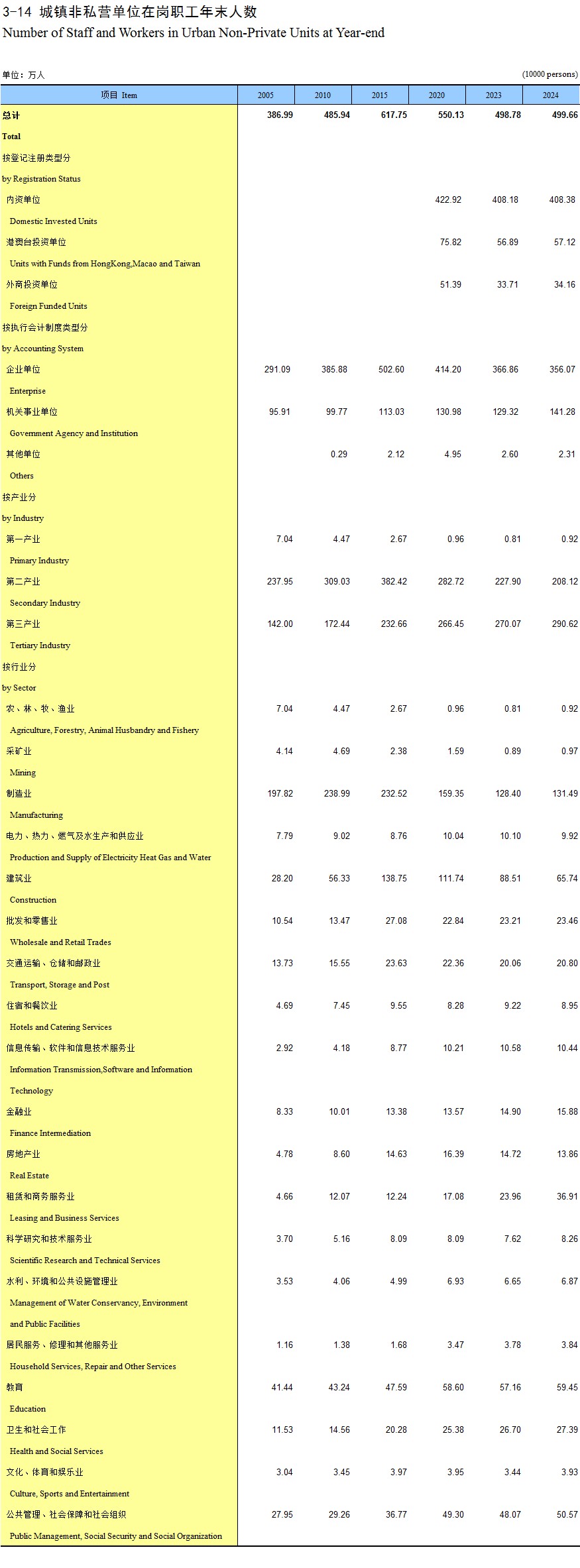 3-14 城镇非私营单位在岗职工年末人数