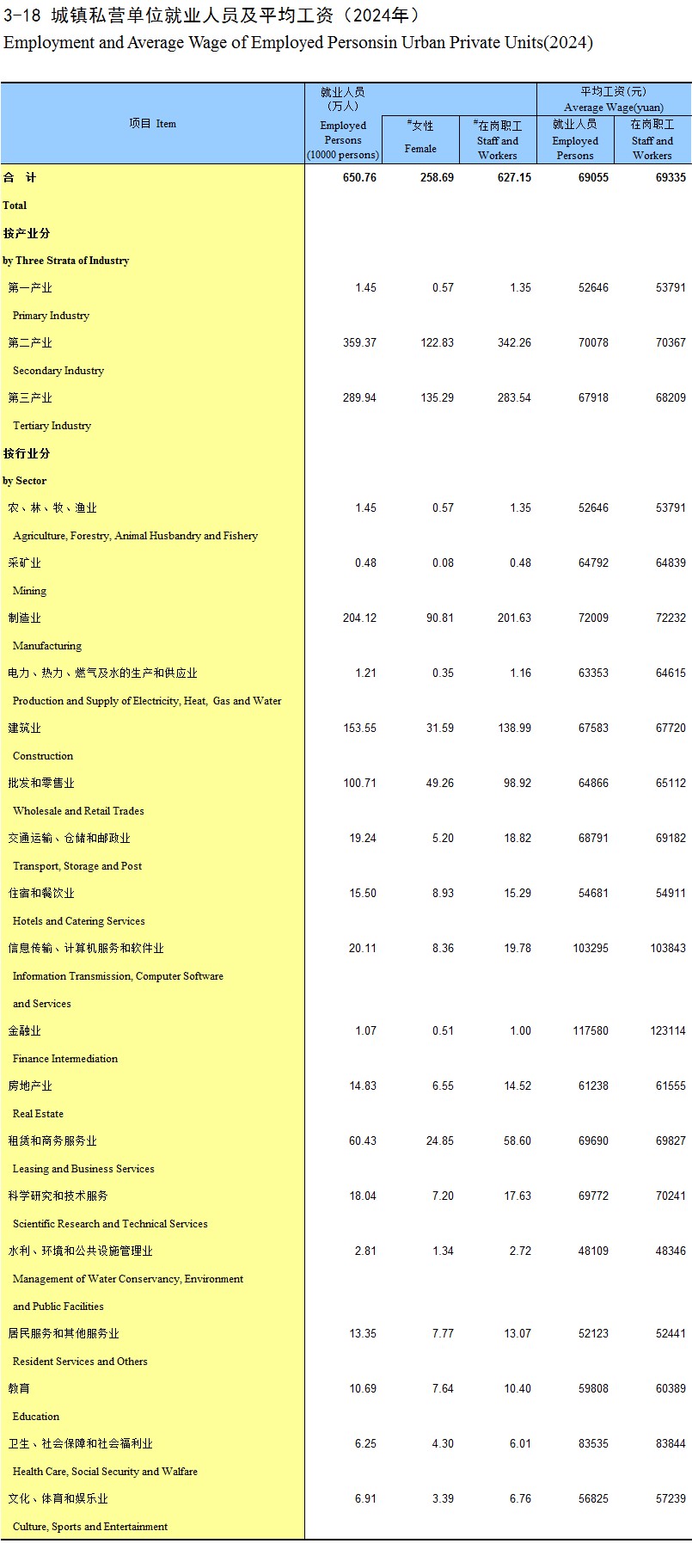 3-18 城镇私营单位就业人员及平均工资(2024年)