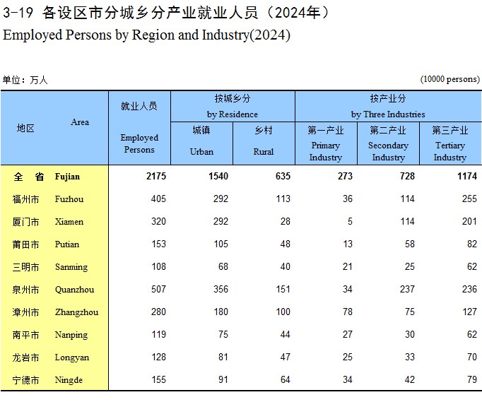 3-19 各设区市分城乡分产业就业人员(2024年)