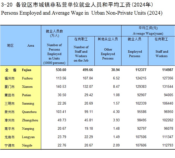 3-20 各设区市城镇非私营单位就业人员和平均工资(2024年)