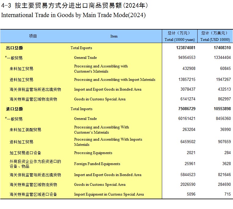 4-3 按主要贸易方式分进出口商品贸易额(2024年)