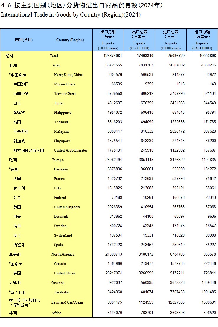 4-6 按主要国别(地区)分货物进出口商品贸易额(2024年)