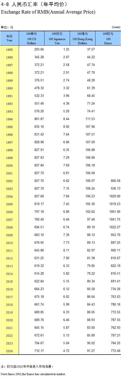 4-8 人民币汇率(年平均价)