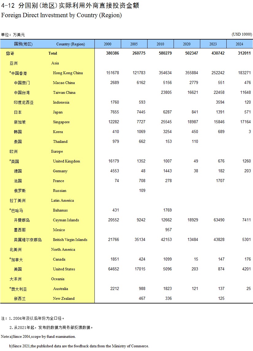 4-12 分国别(地区)实际利用外商直接投资金额