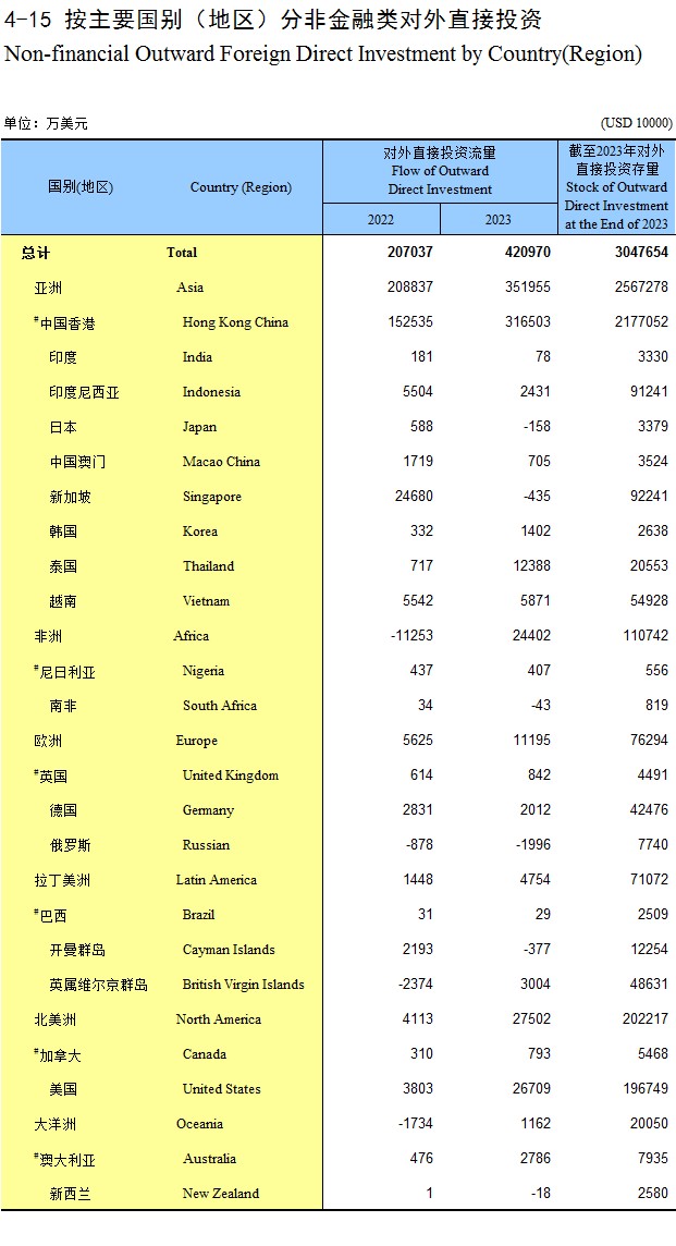 4-15 按主要国别(地区)分非金融类对外直接投资