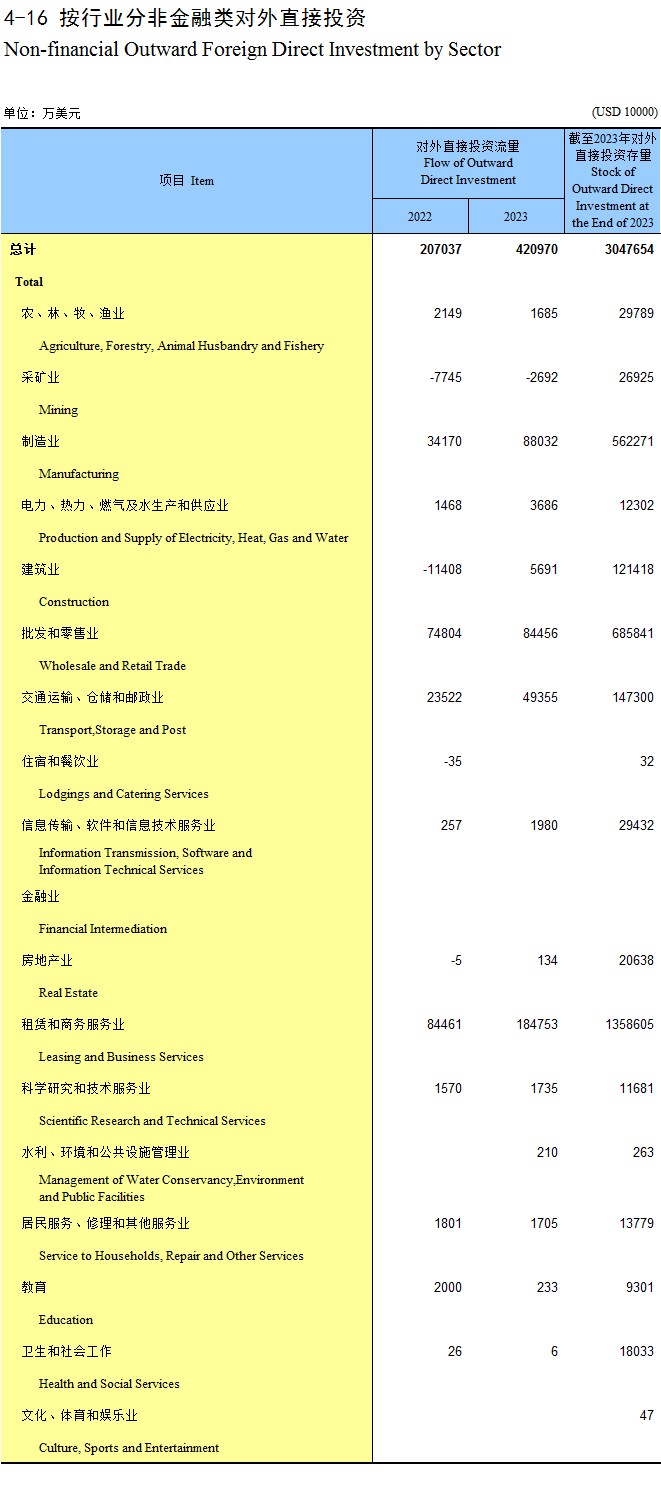 4-16 按行业分非金融类对外直接投资