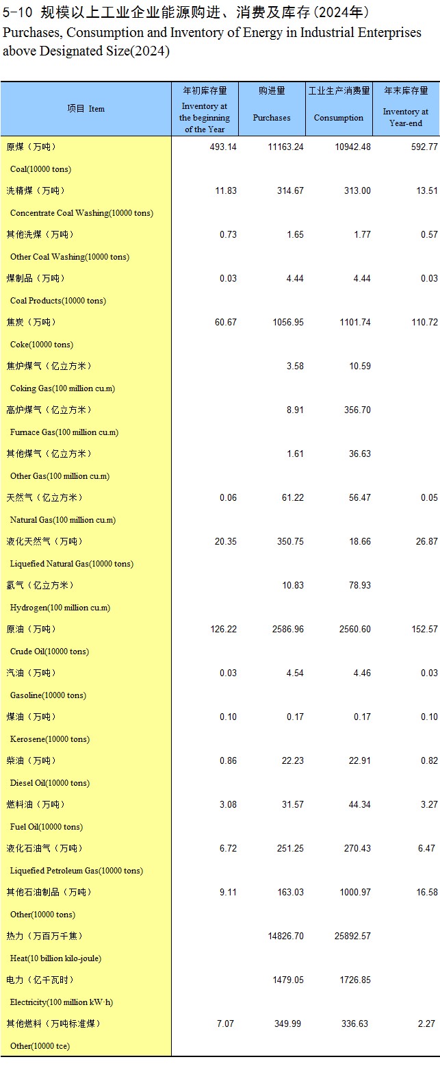 5-10 规模以上工业企业能源购进、消费及库存(2024年)