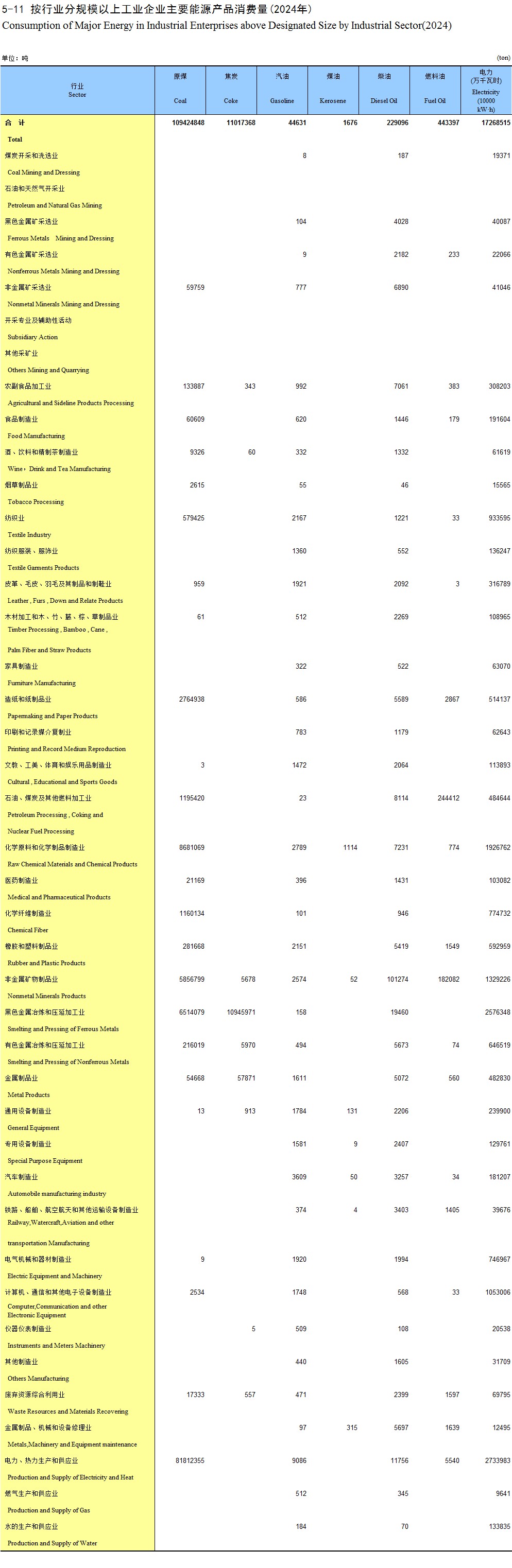 5-11 按行业分规模以上工业企业主要能源产品消费量(2024年)