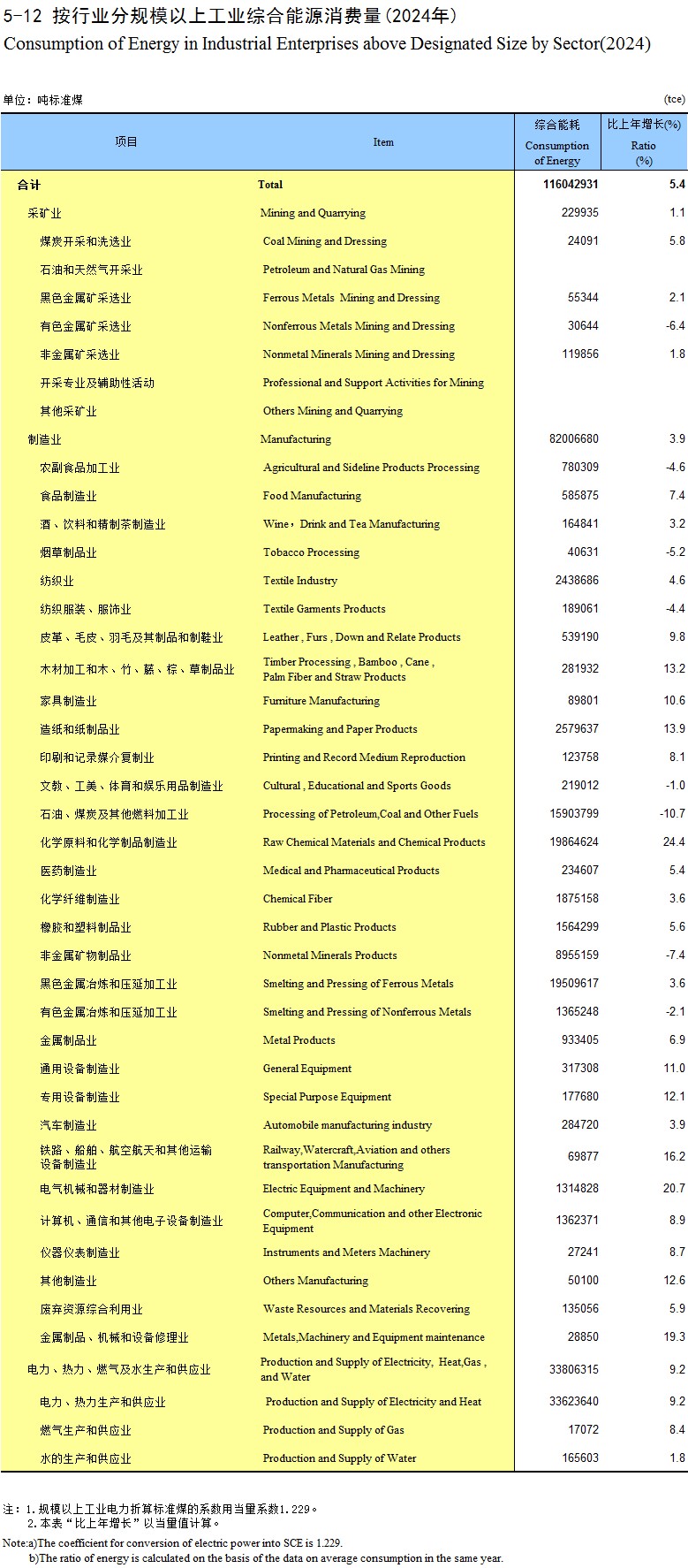 5-12 按行业分规模以上工业综合能源消费量(2024年)
