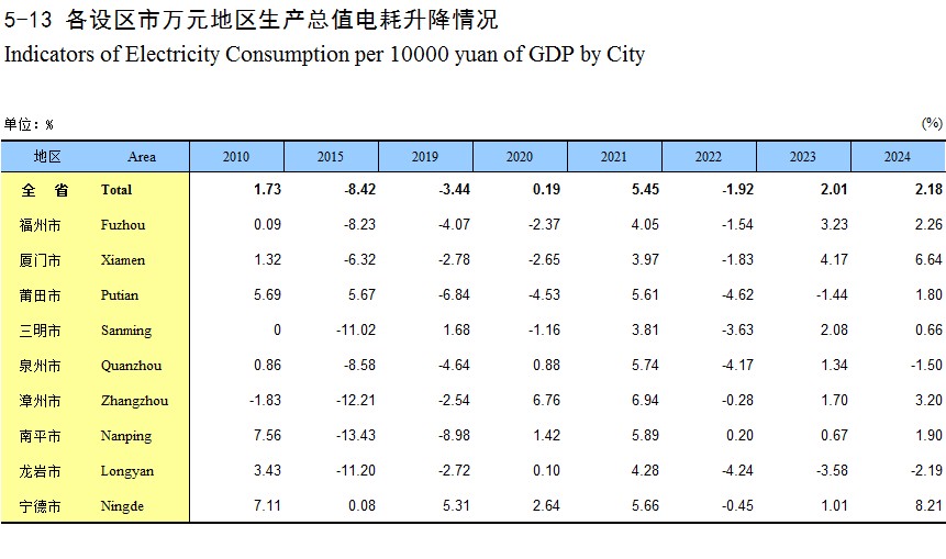 5-13 各设区市万元地区生产总值电耗升降情况