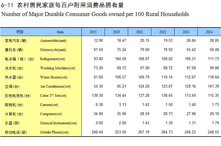 6-11 农村居民家庭每百户耐用消费品拥有量