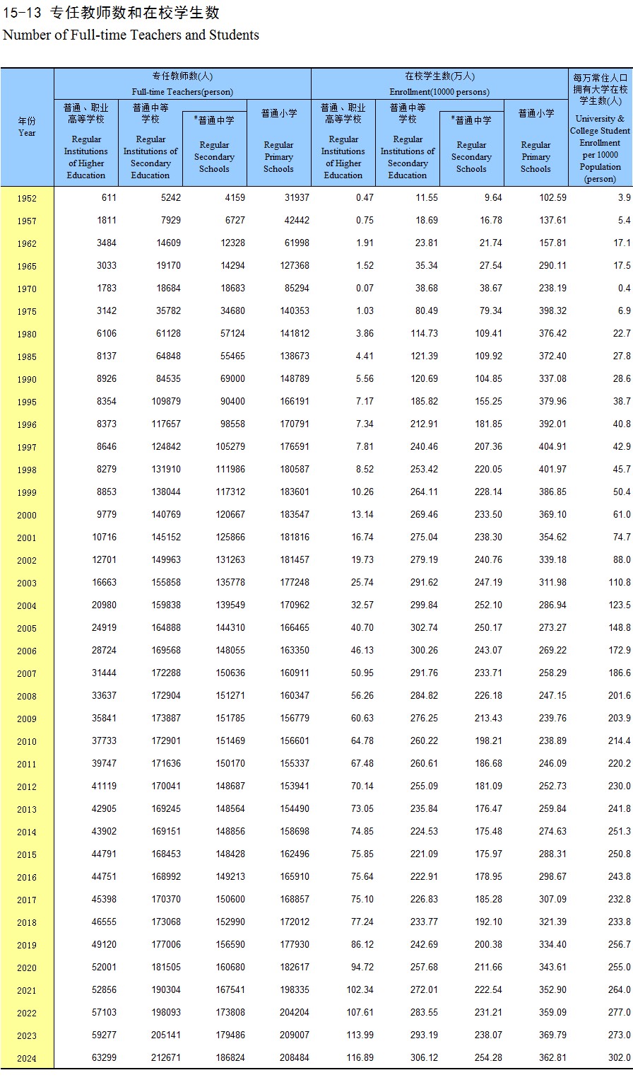 15-13 专任教师数和在校学生数