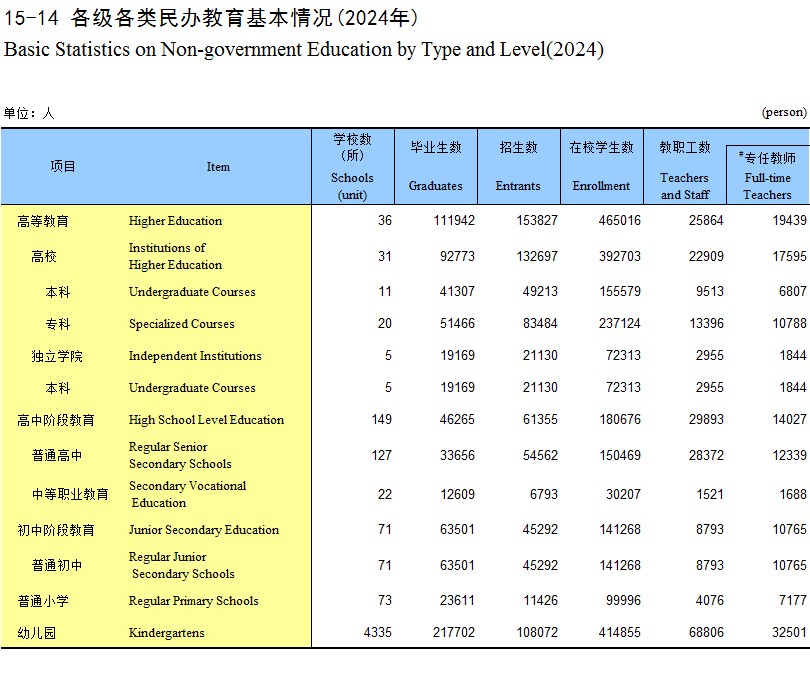 15-14 各级各类民办教育基本情况(2024年)