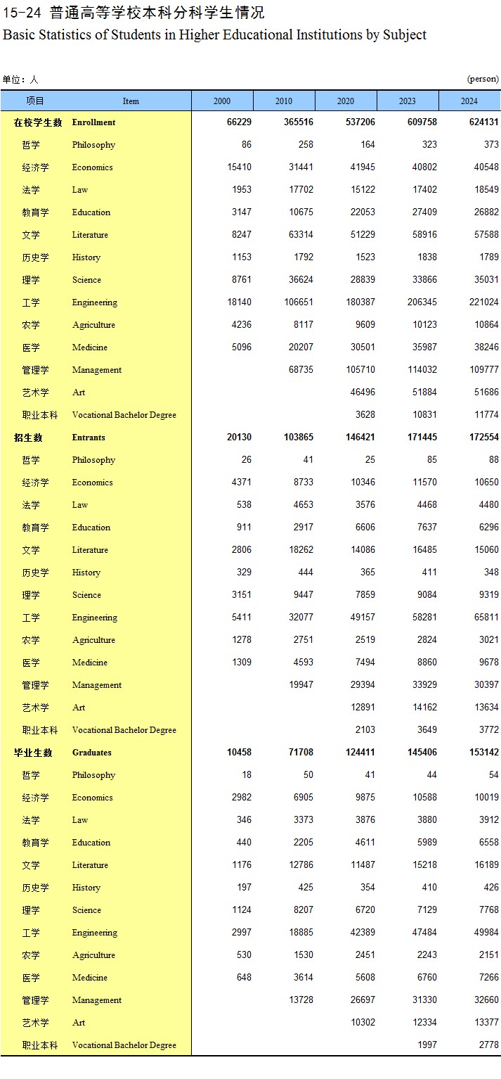 15-24 普通高等学校本科分科学生情况