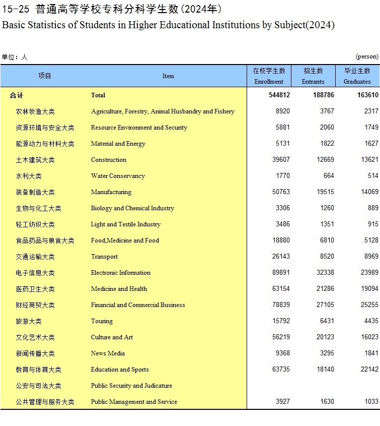 15-25 普通高等学校专科分科学生数(2024年)