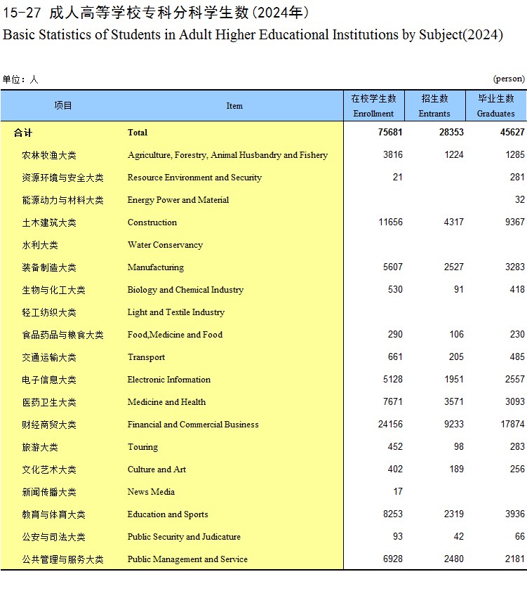 15-27 成人高等学校专科分科学生数(2024年)