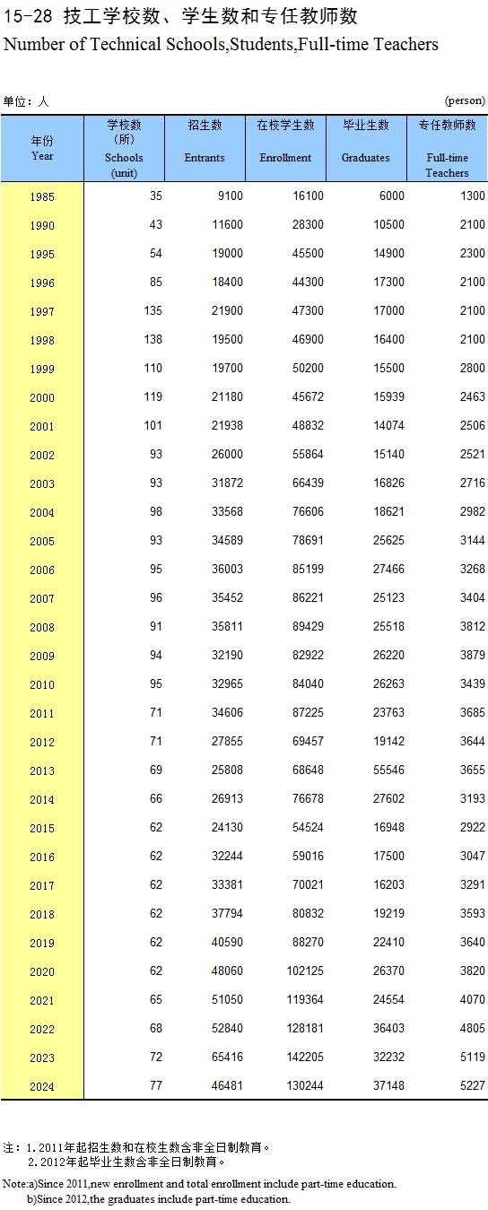 15-28 技工学校数、学生数和专任教师数