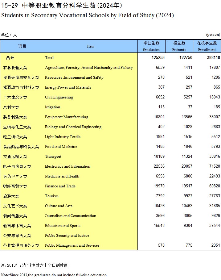 15-29 中等职业教育分科学生数(2024年)