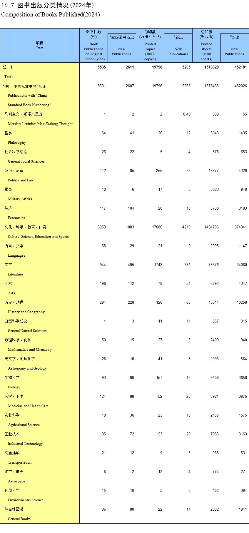 16-7 图书出版分类情况(2024年)