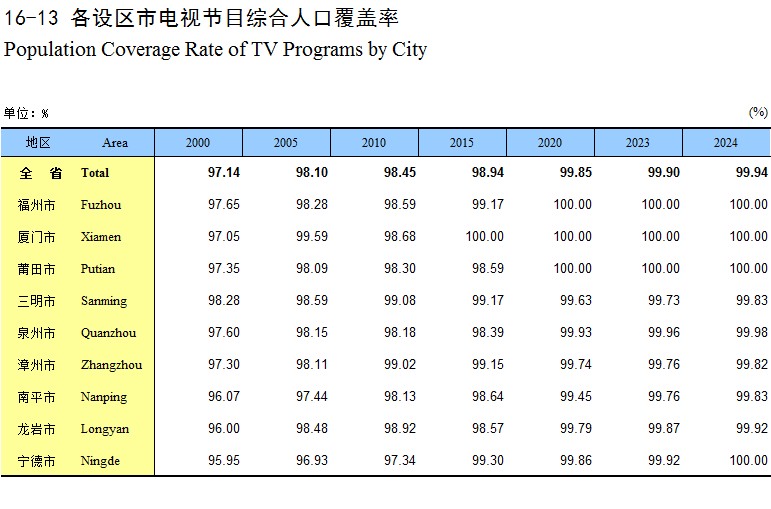 16-13 各设区市电视节目综合人口覆盖率