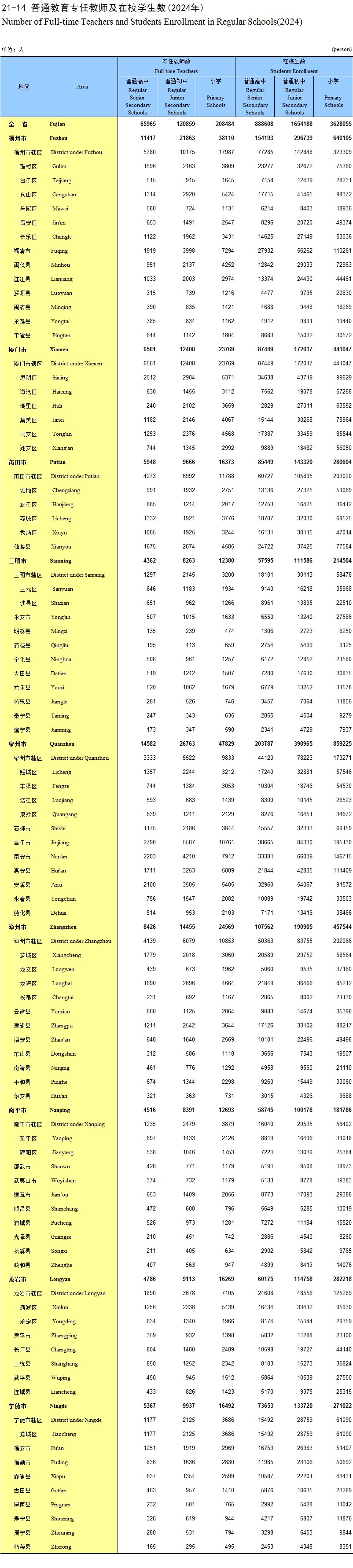 21-14 普通教育专任教师及在校学生数(2024年)